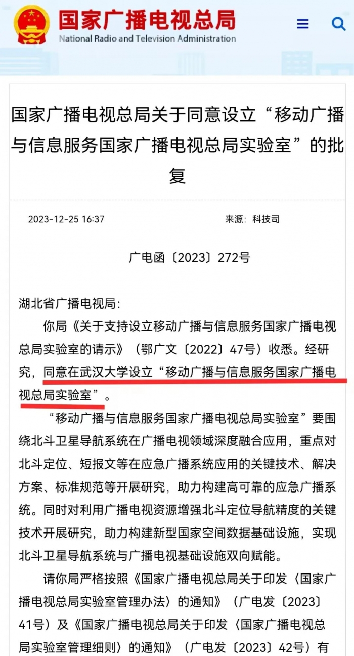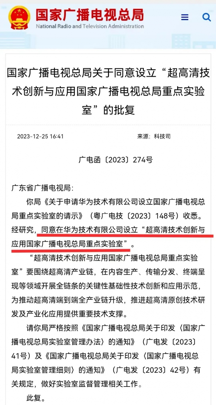同一时间被批复设立的还有华为技术有限公司“超高清技术创新与应用国家广播电视总局重点实验室”,武汉大学“移动广播与信息服务国家广播电视总局实验室”。