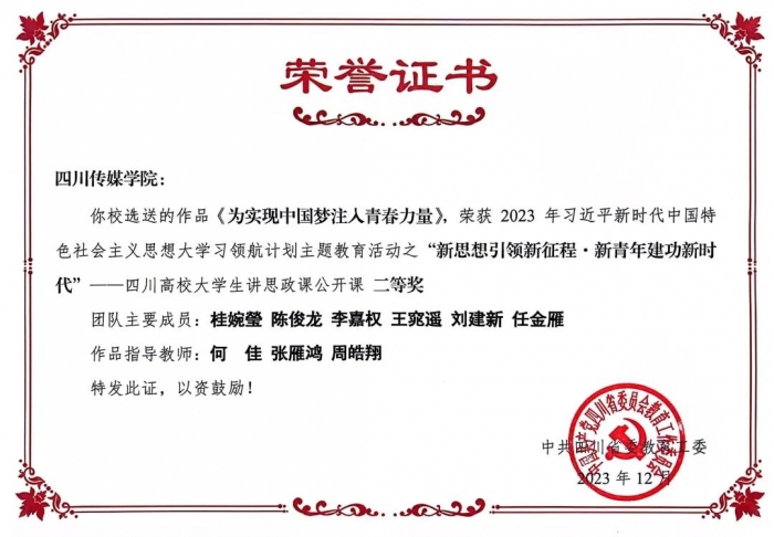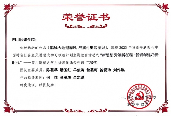 为坚持不懈用习近平新时代中国特色社会主义思想铸魂育人,展现新时代大学生的马克思主义理论素养和精神风貌,按照 《中共四川省委教育工委关于开展习近平新时代中国特色社会 主义思想大学习领航计划主题教育活动的通知》安排,省委教育工委组织了“新思想引领新征程·新青年建功新时代”——高校大学生讲思政课公开课和“我心中的思政课”——高校大学生微电影展示活动。经学校推荐、大众评审、专家评审,近期,省委教育工委办公室将评选结果予以公布。四川传媒学院参赛作品获一等奖2项、二等奖2项。