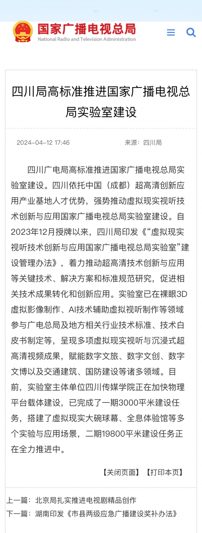 目前,川传影视硅谷在国家广播电视总局和四川省广播电视局指导下正在加快虚拟现实视听技术国家广电总局实验室的物理平台载体建设,已完成了一期3000平米建设任务,搭建了虚拟现实大碗球幕、全息体验馆等多个实验与应用场景,二期19800平米科研实验大楼建设任务正在全力推进中。