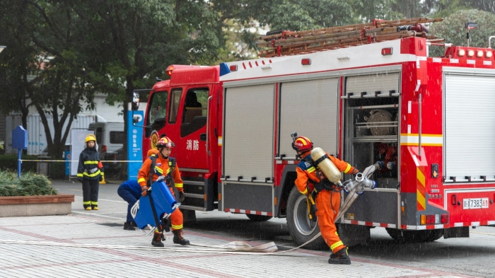 紧接着,一场紧张而有序的消防疏散演练在A2教学楼展开。随着警报声的响起,教学楼内的师生迅速进入应急状态,他们按照事先规划的疏散路线,用毛巾捂住口鼻,快速且有序地从楼内撤离至安全区域。同时,微型消防站队员也迅速响应,对模拟起火点进行喷水操练。随后,郫都区消防救援大队的专业救援力量进入现场,搜救受伤被困人员。经过各组人员的协同配合,明火很快被扑灭,受困人员成功获救,演练圆满结束。