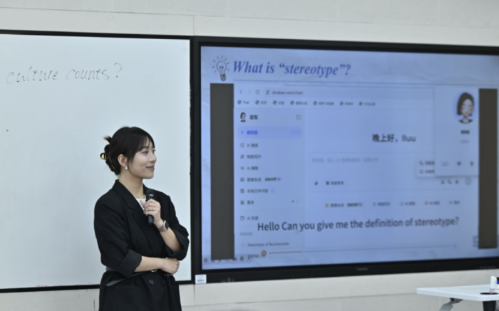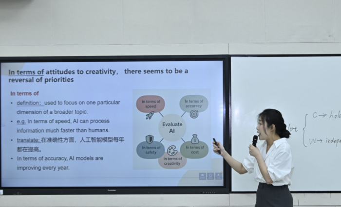 本次比赛共设两个环节:团队负责人需以中文阐述教学设计思路,突出教材与数智技术的融合策略;另一名教师则需进行英语课堂教学展示。四支参赛团队分别来自有声语言艺术学院、国际教育学院和外国语部,其教学节段涵盖《Chinese Style》《Why Culture Counts》《The Meaning of Life》《Animation Growing in Popularity》等内容。各团队通过情景模拟、案例分析、跨文化对比等创新形式,生动诠释了如何以语言为桨、以教材为舟,引导学生理解中国、探索世界。