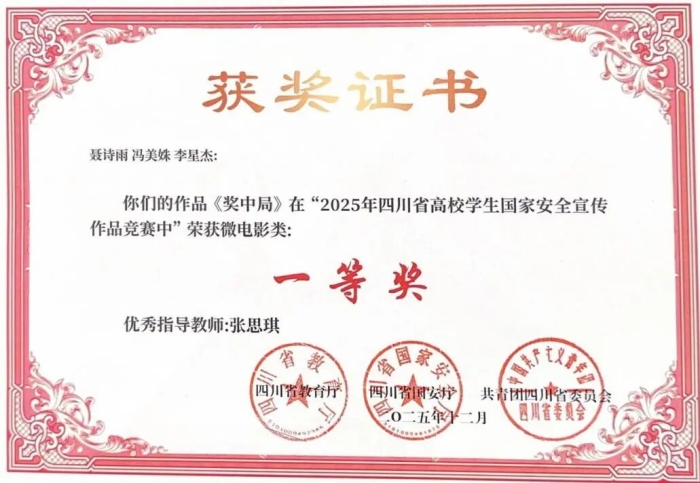 四川传媒学院融合媒体学院学生团队聂诗雨、冯美姝、李星杰制作的微电影《奖中局》,获大赛微电影赛道一等奖,张思琪老师获优秀指导教师荣誉称号。