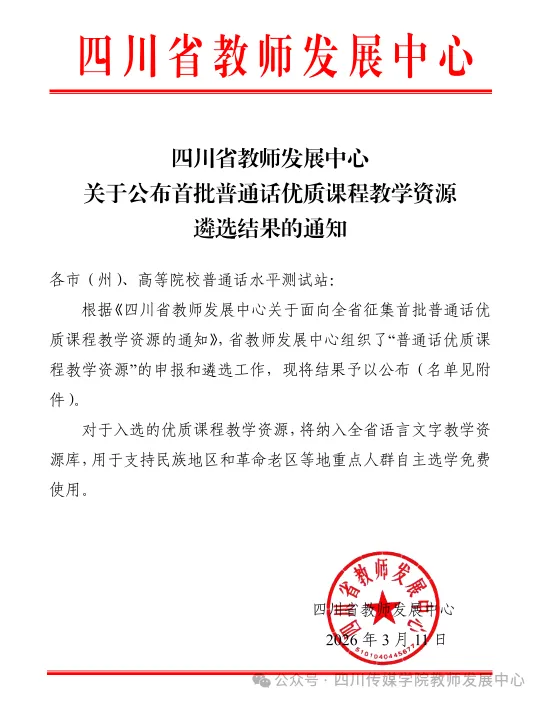 近日,四川省教师发展中心正式公布首批普通话优质课程教学资源遴选结果。四川传媒学院教师申报的6门课程入选“5分钟‘微课’”。入选数量位居全省高校前列。