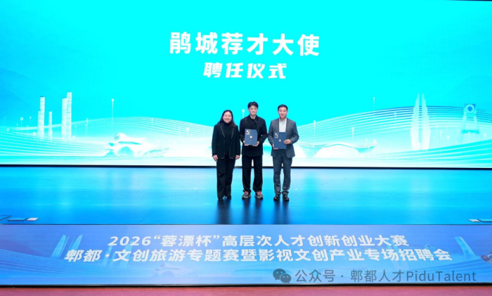 现场还举行了“鹃城荐才大使”聘任仪式。四川传媒学院党委常委、副校长李巍与《哪吒》系列太乙真人配音演员张珈铭受聘为“鹃城荐才大使”。