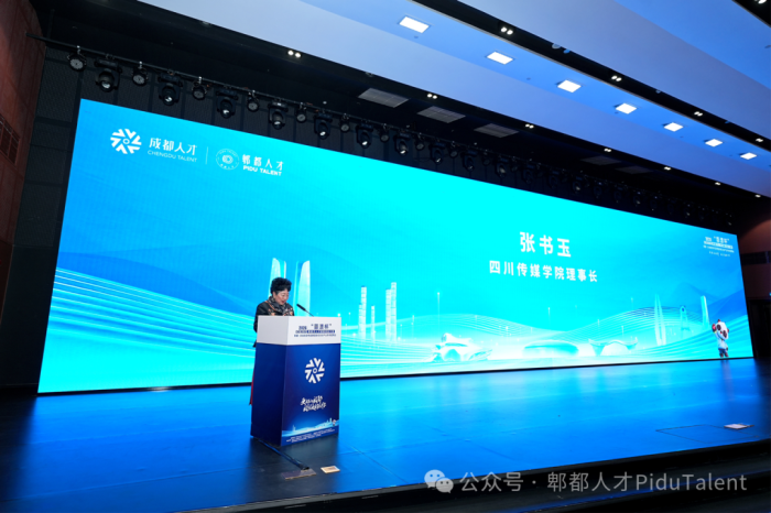 四川传媒学院理事长张书玉出席活动并致欢迎辞。她表示,作为扎根郫都、成长于成都的高校,四川传媒学院始终以服务地方发展为己任。此次校地联合打造的“赛聘结合”平台,既是为学子铺路、为产业架桥的务实举措,也是双方以赛引才、推动“四链融合”赋能园区发展的关键行动,充分彰显了校地广纳英才、共谋发展的诚意。她希望更多四川传媒学院学生留在郫都、建设成都,为这片热土贡献“川传力量”。
