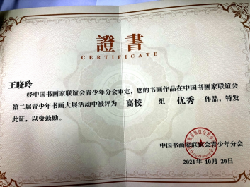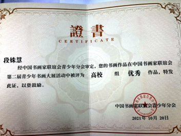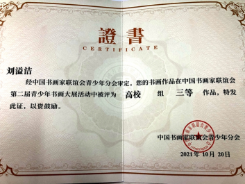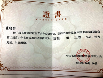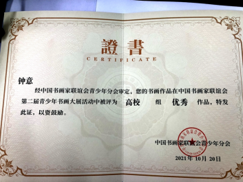 ——我校九名学生荣获中国书画家联谊会第二届青少年书画大展高校组三等作品和优秀作品证书
