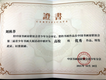 10月20日,中国书画家联谊会第二届青少年书画大展获奖名单揭晓,眉山药科职业学院书法协会九名同学分别荣获高校组三等奖和优秀奖。其中,有三名同学荣获三等作品证书,六名同学荣获优秀作