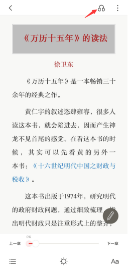 听书(看书时轻点屏幕中央,点击右上角的“耳机”即可听书,推荐使用 实验室版 男声/女声,该页面也可设置屏幕背景、字体大小、翻页效果等)