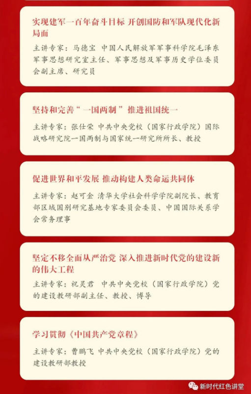 依托权威专业的师资力量,“红色讲堂”现已建成涵盖中华民族伟大复兴中国梦、经济建设、政治建设、文化建设、社会建设、生态文明建设、总体国家安全观、国防和军队建设、祖国完全统一、人类命运共同体与大国外交、党的建设等十八大专辑的完整思政知识体系。